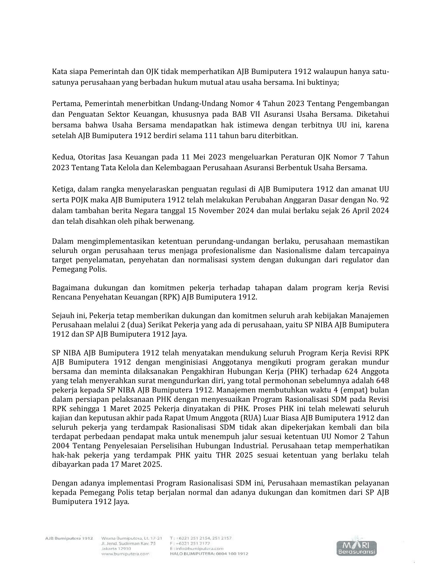 SP NIBA AJB Bumiputera 1912 telah menyatakan mendukung seluruh Program Kerja Revisi RPK AJB Bumiputera 1912 dengan menginisiasi Anggotanya mengikuti program gerakan mundur bersama dan meminta dilaksanakan Pengakhiran Hubungan Kerja (PHK) terhadap 624 Anggota yang telah menyerahkan surat mengundurkan diri, yang total permohonan sebelumnya adalah 648 pekerja kepada SP NIBA AJB Bumiputera 1912. Manajemen membutuhkan waktu 4 (empat) bulan dalam persiapan pelaksanaan PHK dengan menyesuaikan Program Rasionalisasi SDM pada Revisi RPK sehingga 1 Maret 2025 Pekerja dinyatakan di PHK. Proses PHK ini telah melewati seluruh kajian dan keputusan akhir pada Rapat Umum Anggota (RUA) Luar Biasa AJB Bumiputera 1912 dan seluruh pekerja yang terdampak Rasionalisasi SDM tidak akan dipekerjakan kembali dan bila terdapat perbedaan pendapat maka untuk menempuh jalur sesuai ketentuan UU Nomor 2 Tahun 2004 Tentang Penyelesaian Perselisihan Hubungan Industrial. Perusahaan tetap memperhatikan hak-hak pekerja yang terdampak PHK yaitu THR 2025 sesuai ketentuan yang berlaku telah dibayarkan pada 17 Maret 2025.