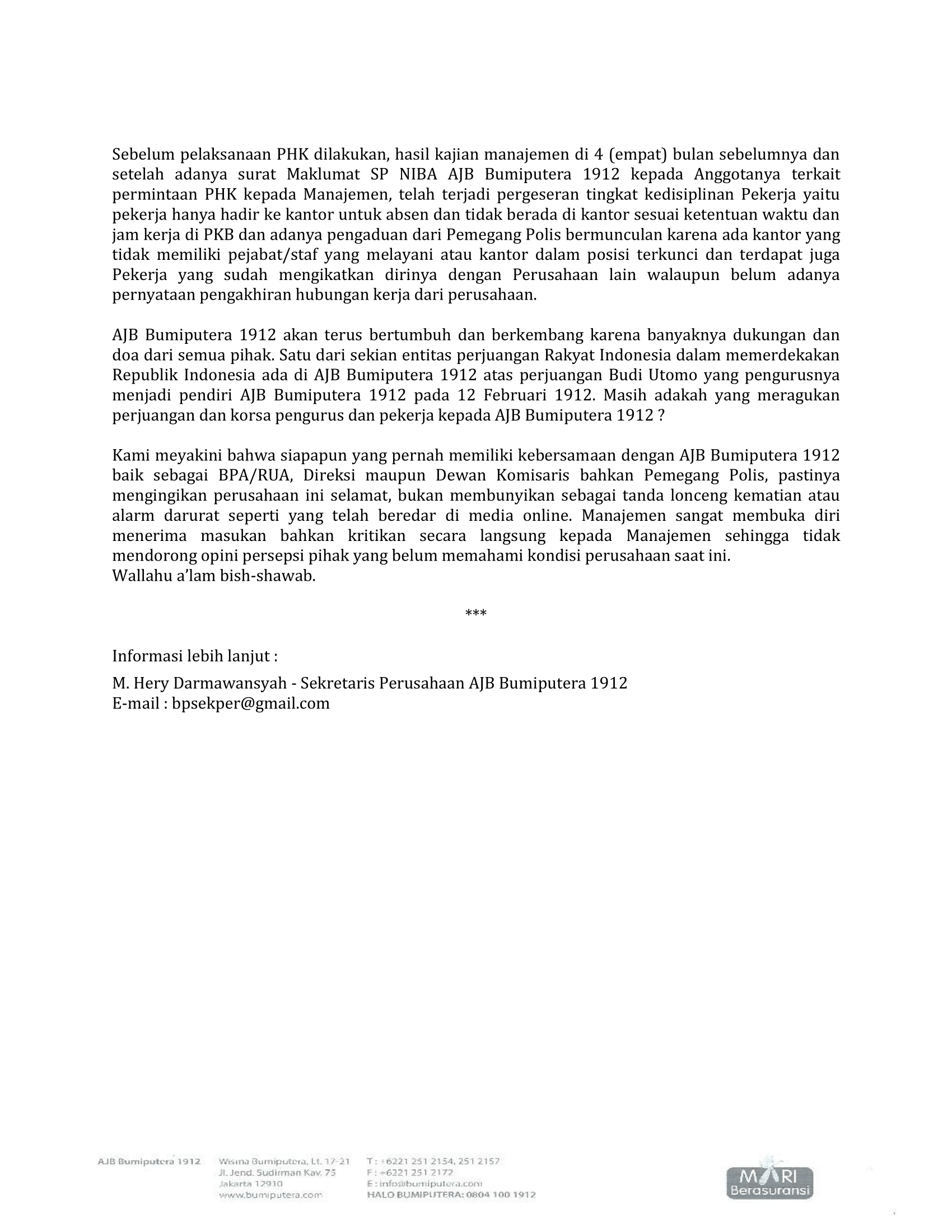 Kami meyakini bahwa siapapun yang pernah memiliki kebersamaan dengan AJB Bumiputera 1912 baik sebagai BPA/RUA, Direksi maupun Dewan Komisaris bahkan Pemegang Polis, pastinya mengingikan perusahaan ini selamat, bukan membunyikan sebagai tanda lonceng kematian atau alarm darurat seperti yang telah beredar di media online. Manajemen sangat membuka diri menerima masukan bahkan kritikan secara langsung kepada Manajemen sehingga tidak mendorong opini persepsi pihak yang belum memahami kondisi perusahaan saat ini.