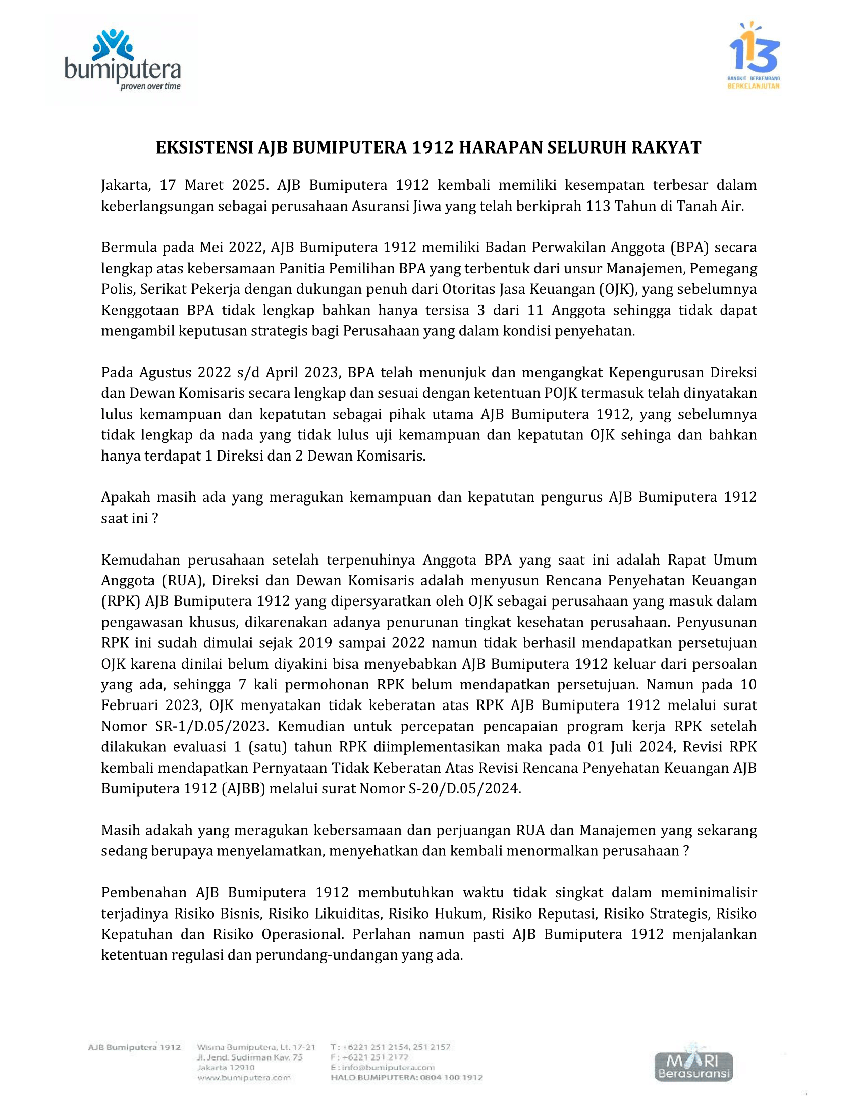 Jakarta, 17 Maret 2025. AJB Bumiputera 1912 kembali memiliki kesempatan terbesar dalam keberlangsungan sebagai perusahaan Asuransi Jiwa yang telah berkiprah 113 Tahun di Tanah Air.